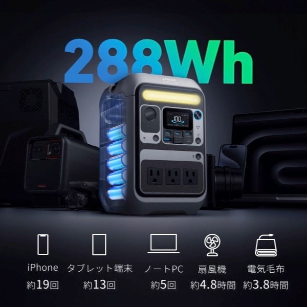 バッテリー容量 288Wh(リン酸鉄リチウムイオン電池)
