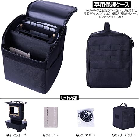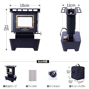 | セット内容 | ストーブ本体、ウィック(芯)x2、ファンネル(漏斗)x1、収納袋(キャリーバッグ)x1 |